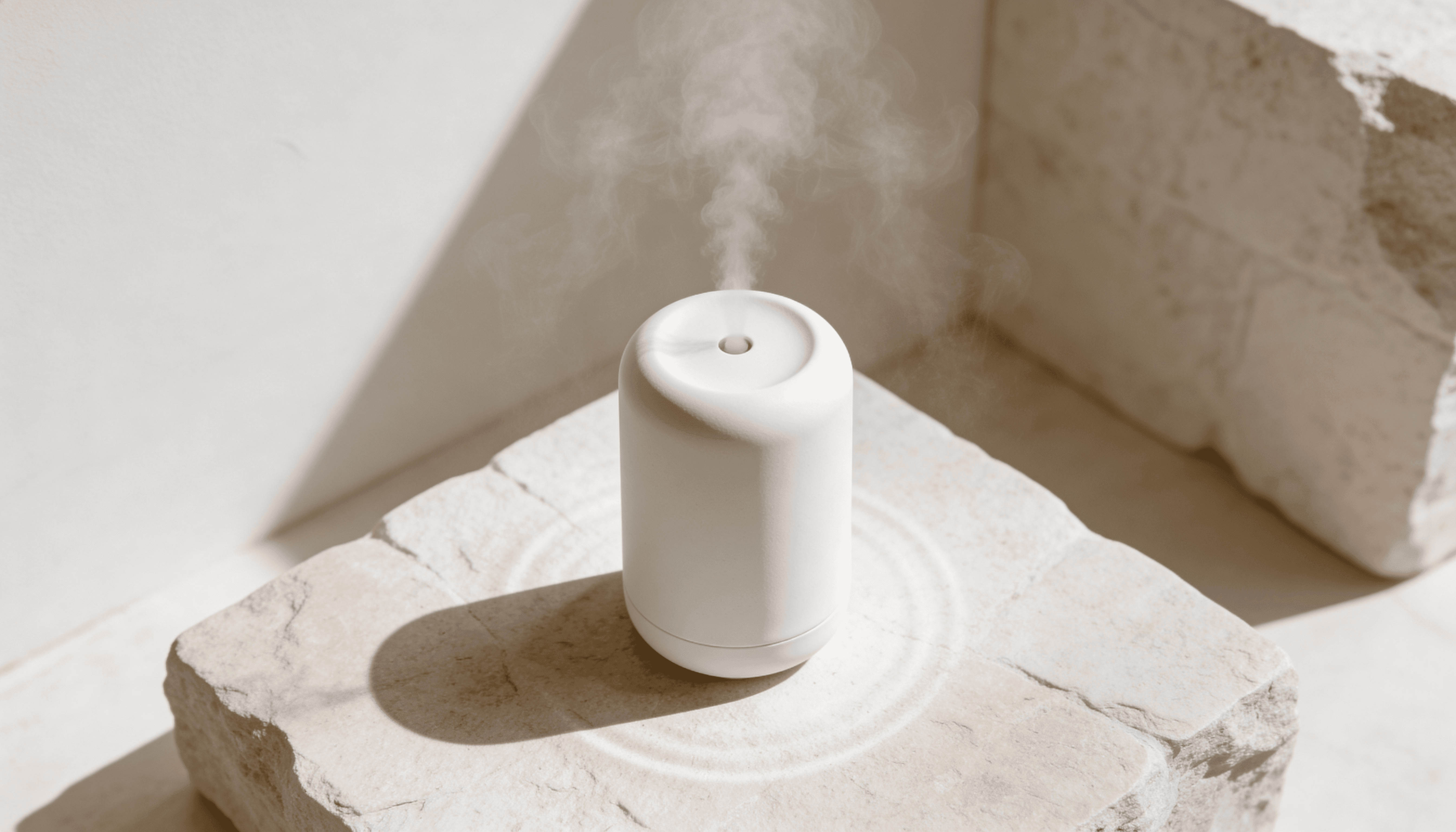Un objeto de bienestar convertido en experiencia visual: vapor, luz y calma en equilibrio.